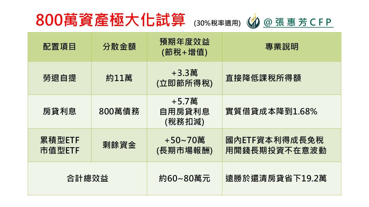 如果您對數字有感、能克制支出,您的核心目標應該是「利用稅務盾牌,極大化複利」。
