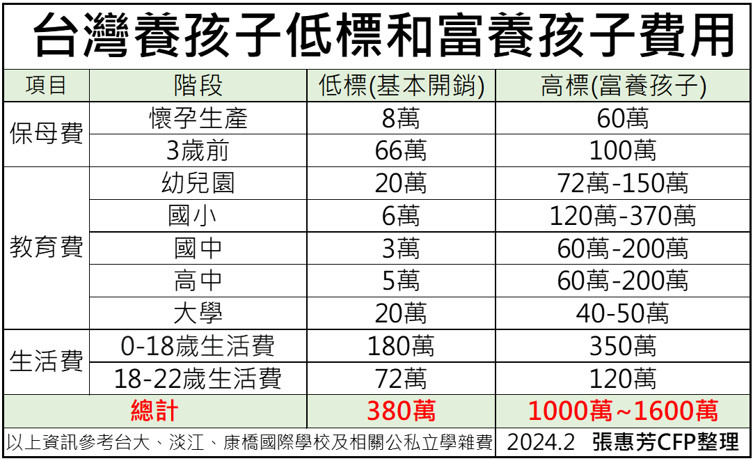 以上在台灣養小孩的總和費用(保母費+教育費+生活費)